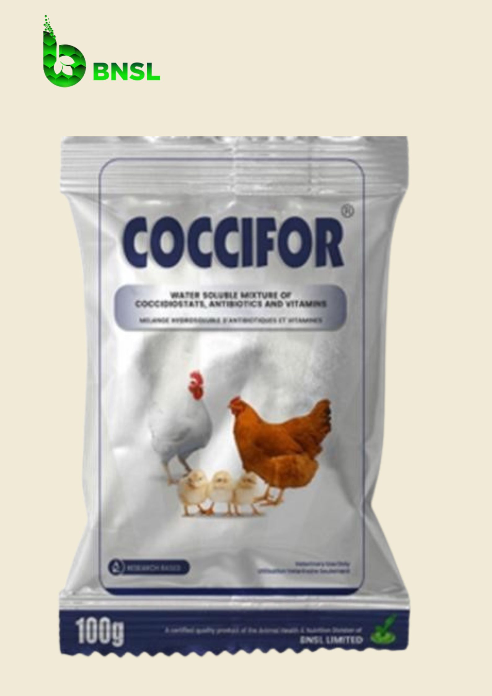 - Water soluble mixture of coccidiostats, antibiotics and vitamins.